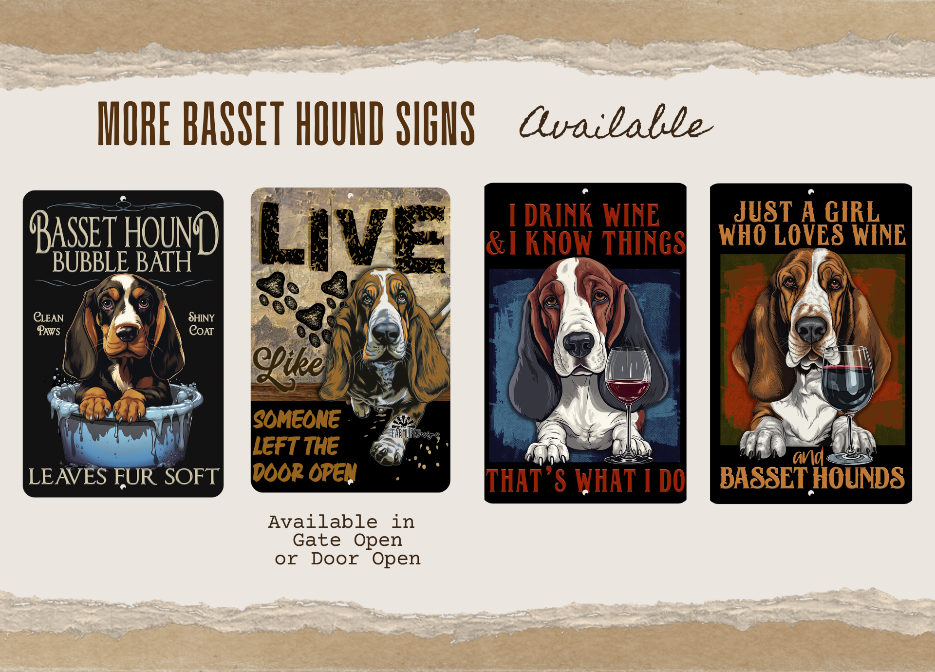 Basset Hound sign, Live Like Someone Left Gate Open (or Door Open) dog metal wall art