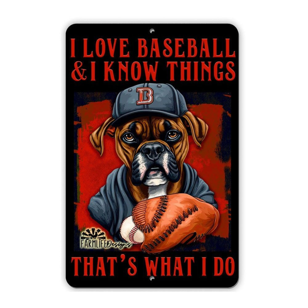 Funny Boxer Dog Baseball Sign - I Love Baseball & I Know Things - That's What I Do featuring a Boxer wearing a baseball cap and holding a baseball and glove.