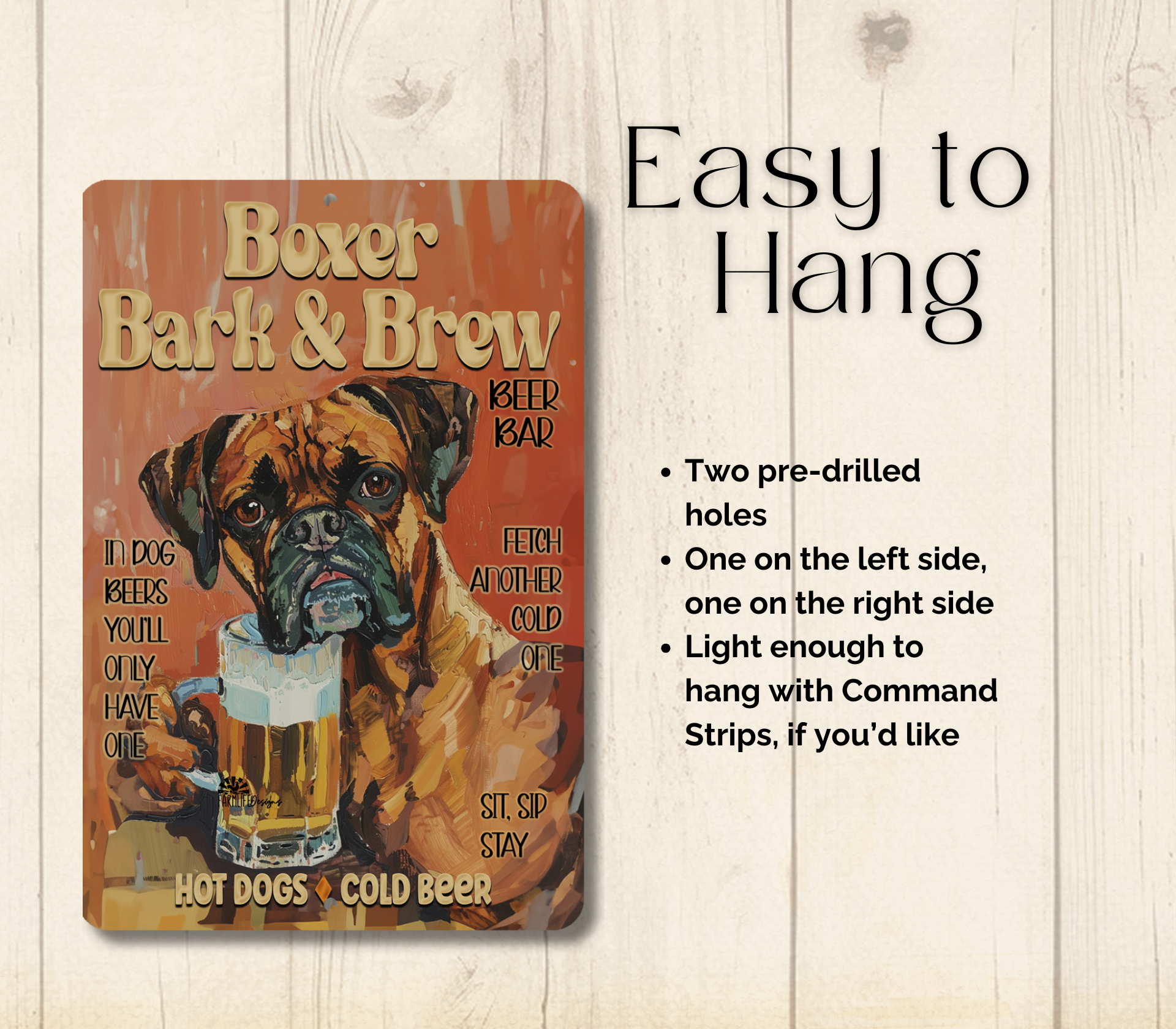 Two pre-drilled holes for easy hanging, one at the top and one at the bottom. The sign is light enough to be hung with command strips.
