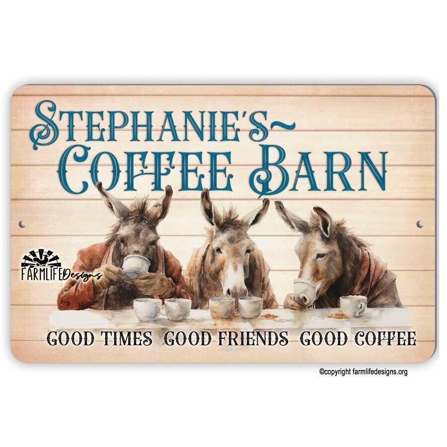 Personalized Coffee Barn Sign with Donkeys drinking coffee.