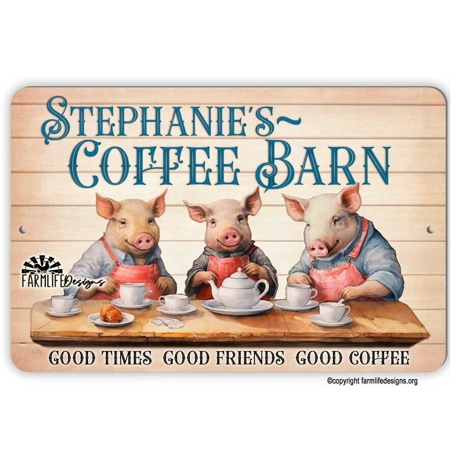 Personalized Coffee Barn Sign with Pigs drinking coffee.