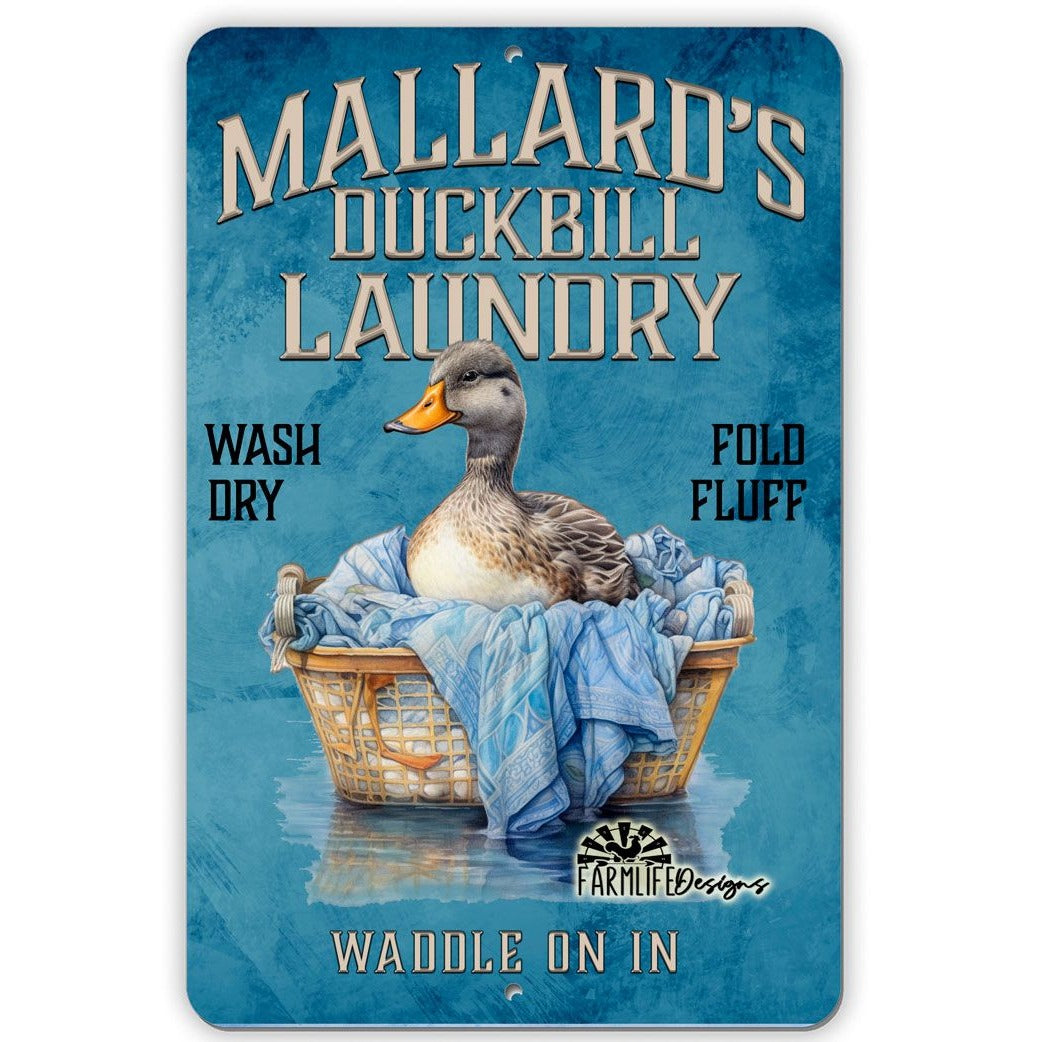Duck Laundry Sign - great artwork for your laundry room designed as an advertisement from Mallard's Duck Bill Laundry, featuring a duck in a clothes basket.