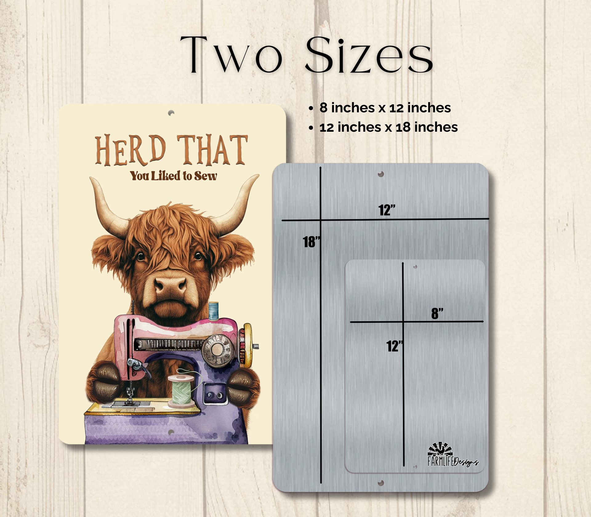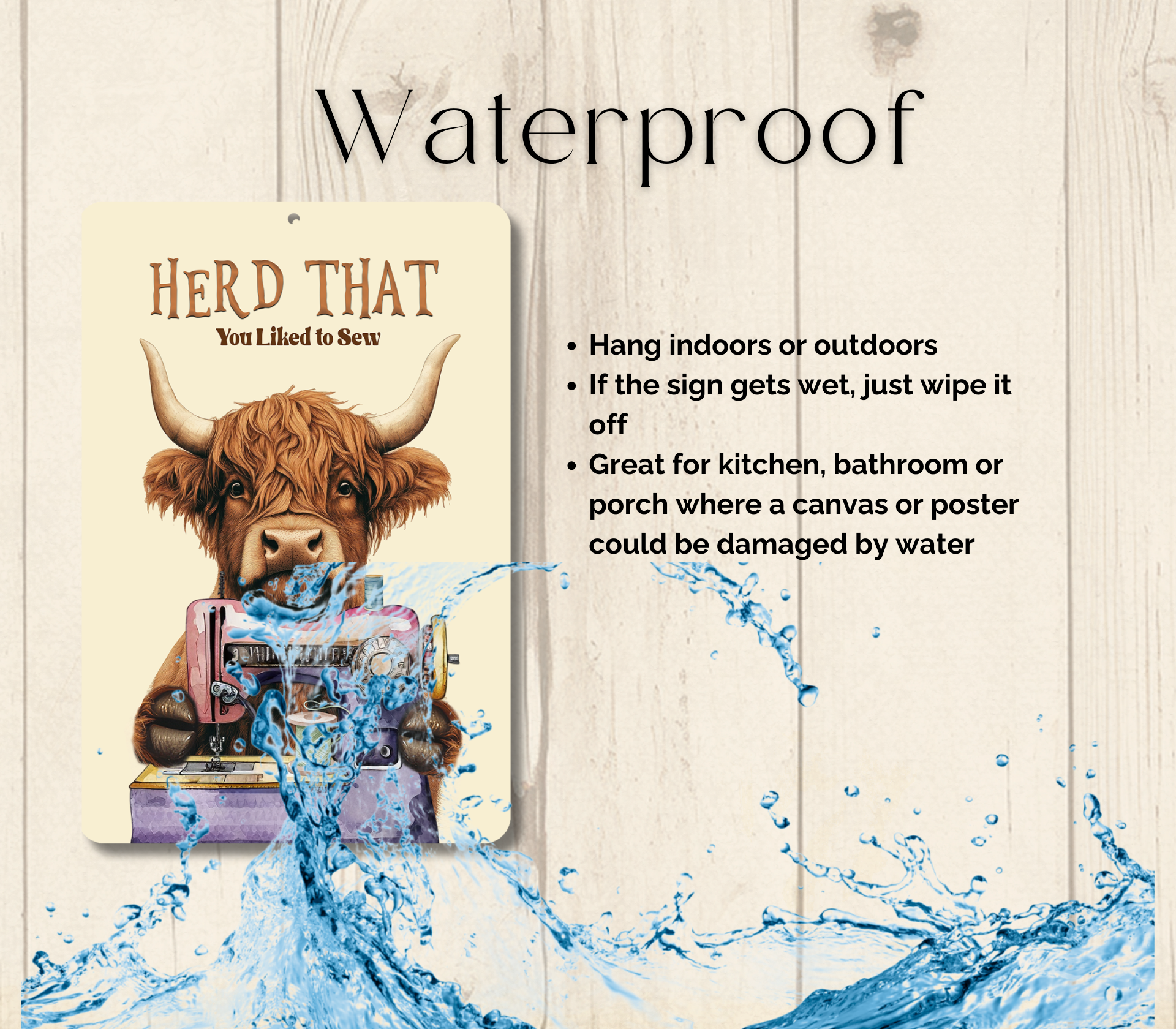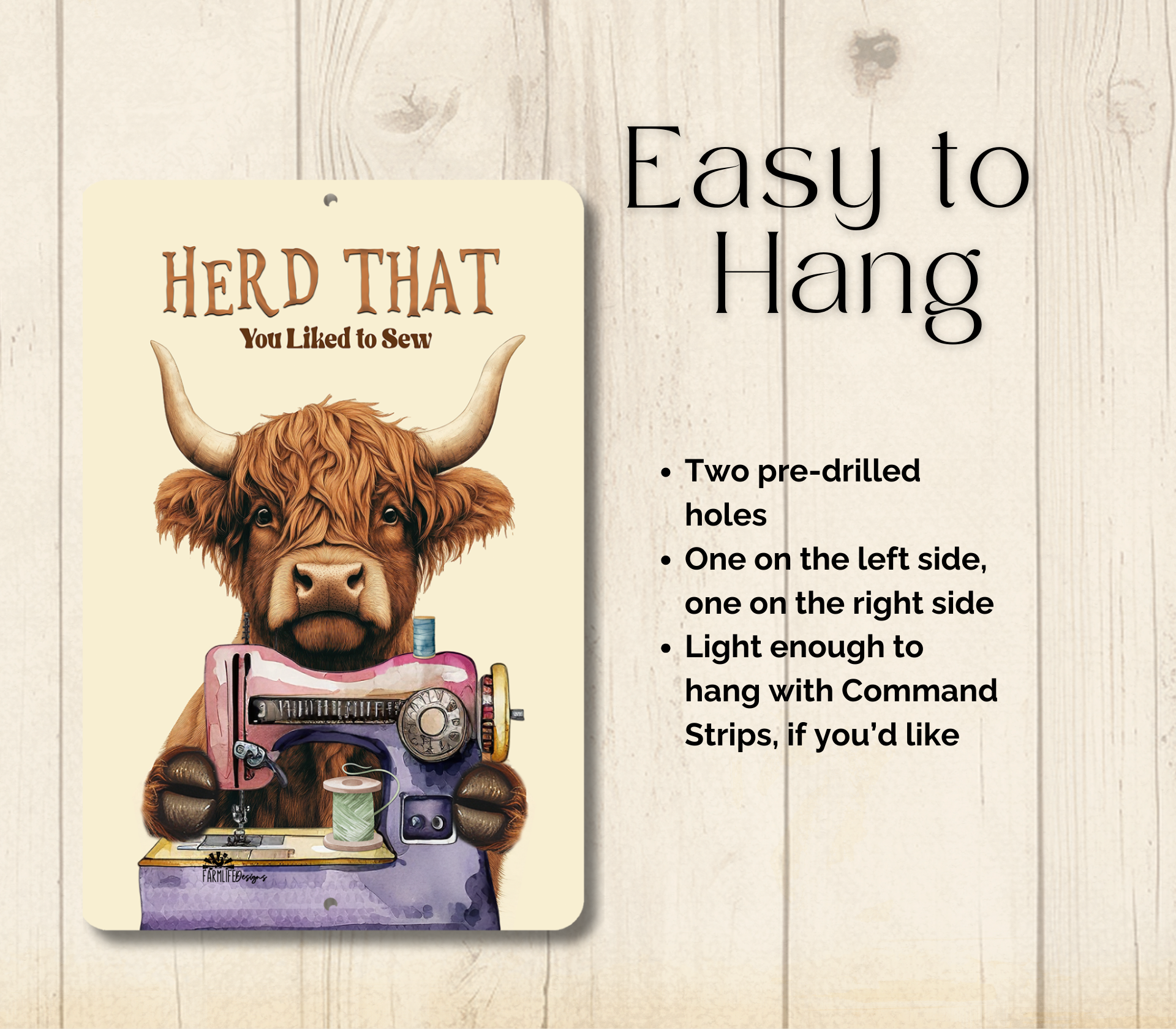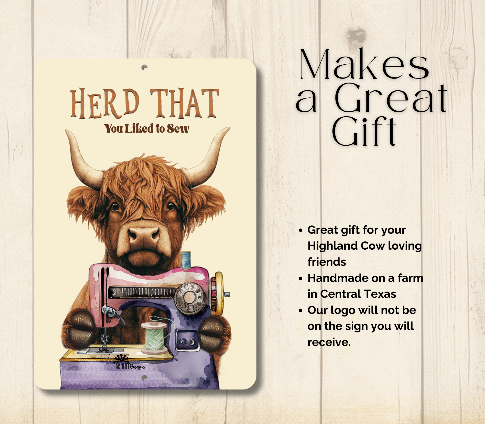 Highland Cow Herd That ... You Liked To Sew showing a fluffy highland cow with a sewing machine. This unique handmade addition to your home, would look great in your den, kitchen, bathroom, on your porch or just about anywhere!