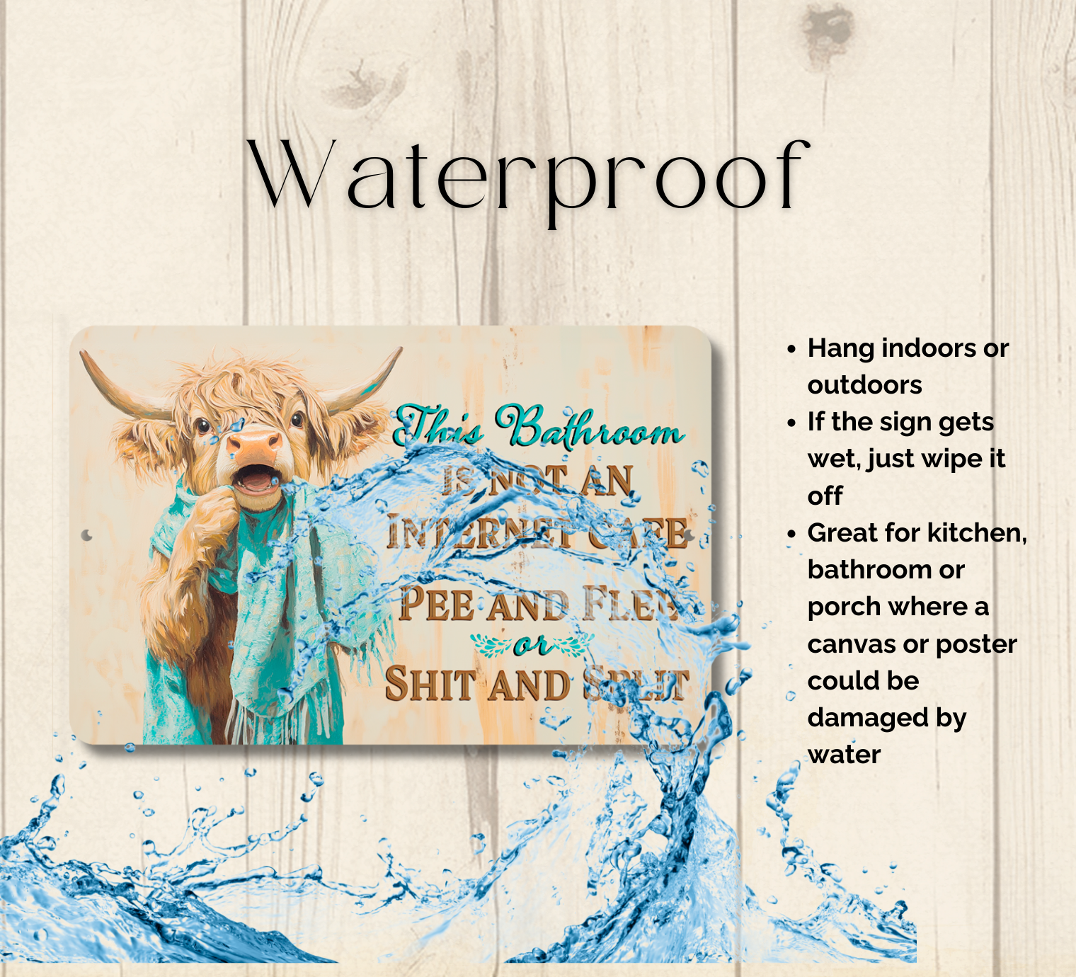 This Bathroom is not an Internet Cafe - Shit and Split or Pee and Flee showing a highland cow with a towel around his neck. This unique handmade addition to your home, would look great in your kitchen, game room, man cave, den or just about anywhere!
