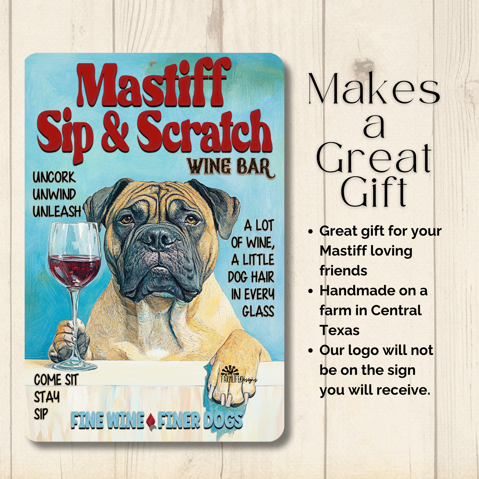 Mastiff Sip & Scratch Wine sign, a unique handmade addition to your home. This sign would look great on in your bar, den, man cave, or wherever you entertain.