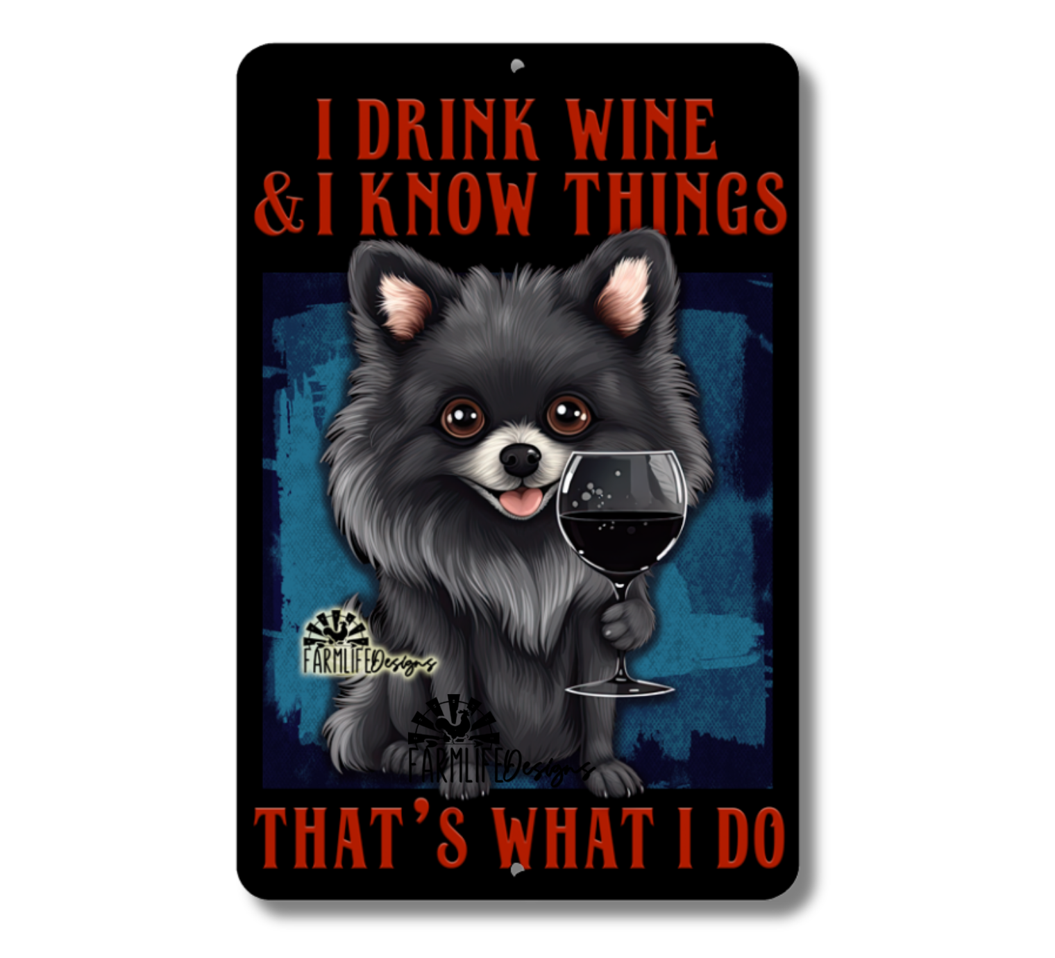 Funny Pomeranian Wine Sign - I Drink Wine and I Know Things - That's What I Do, featuring a Pomeranian holding a glass of wine. Great for your Bar or Man Cave!