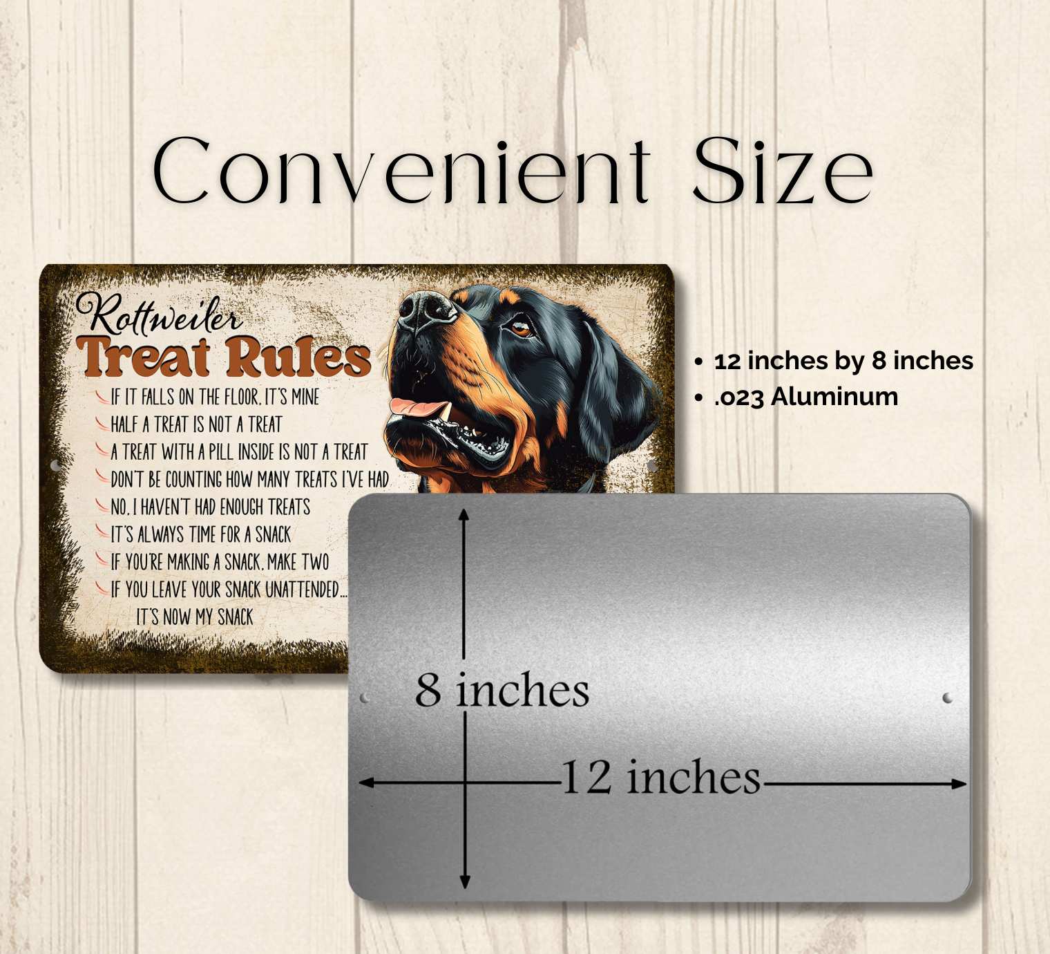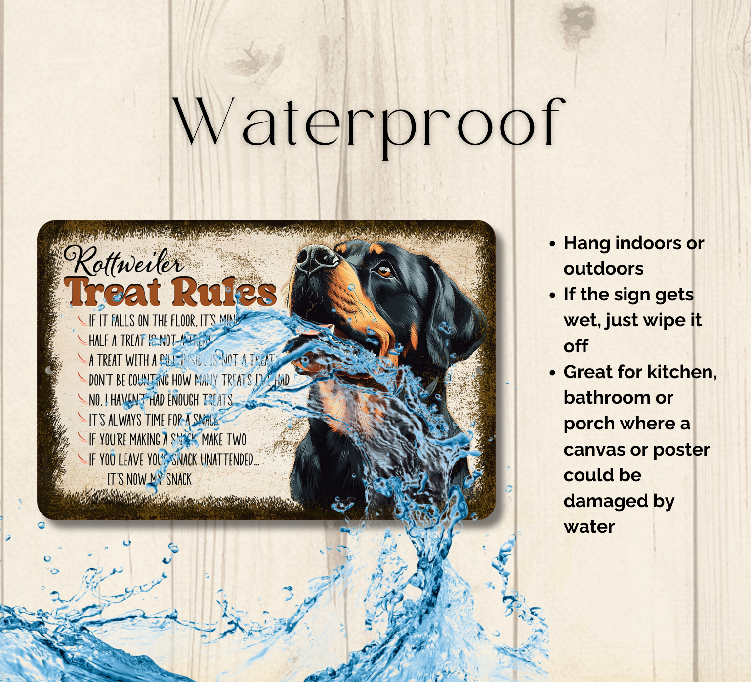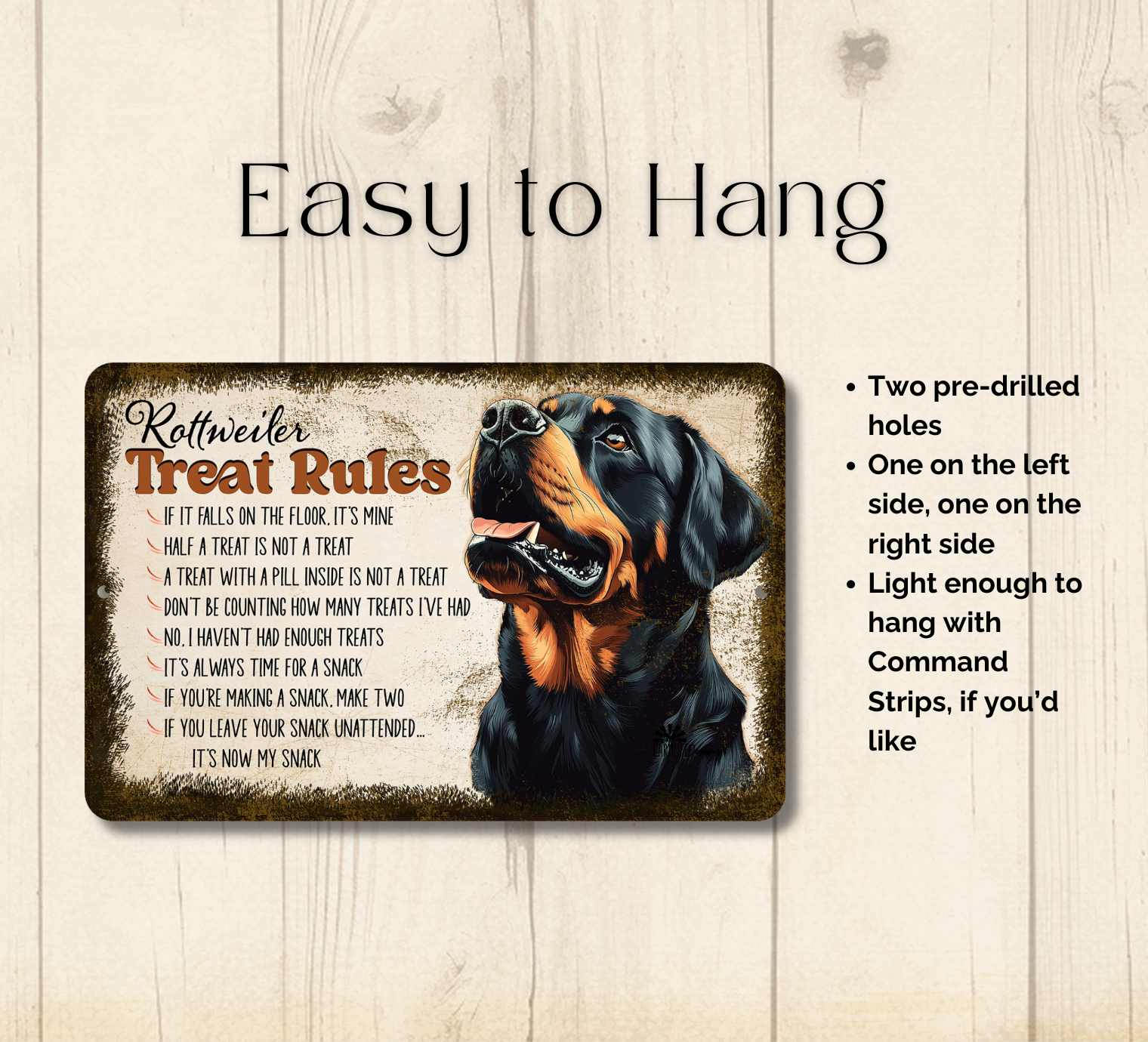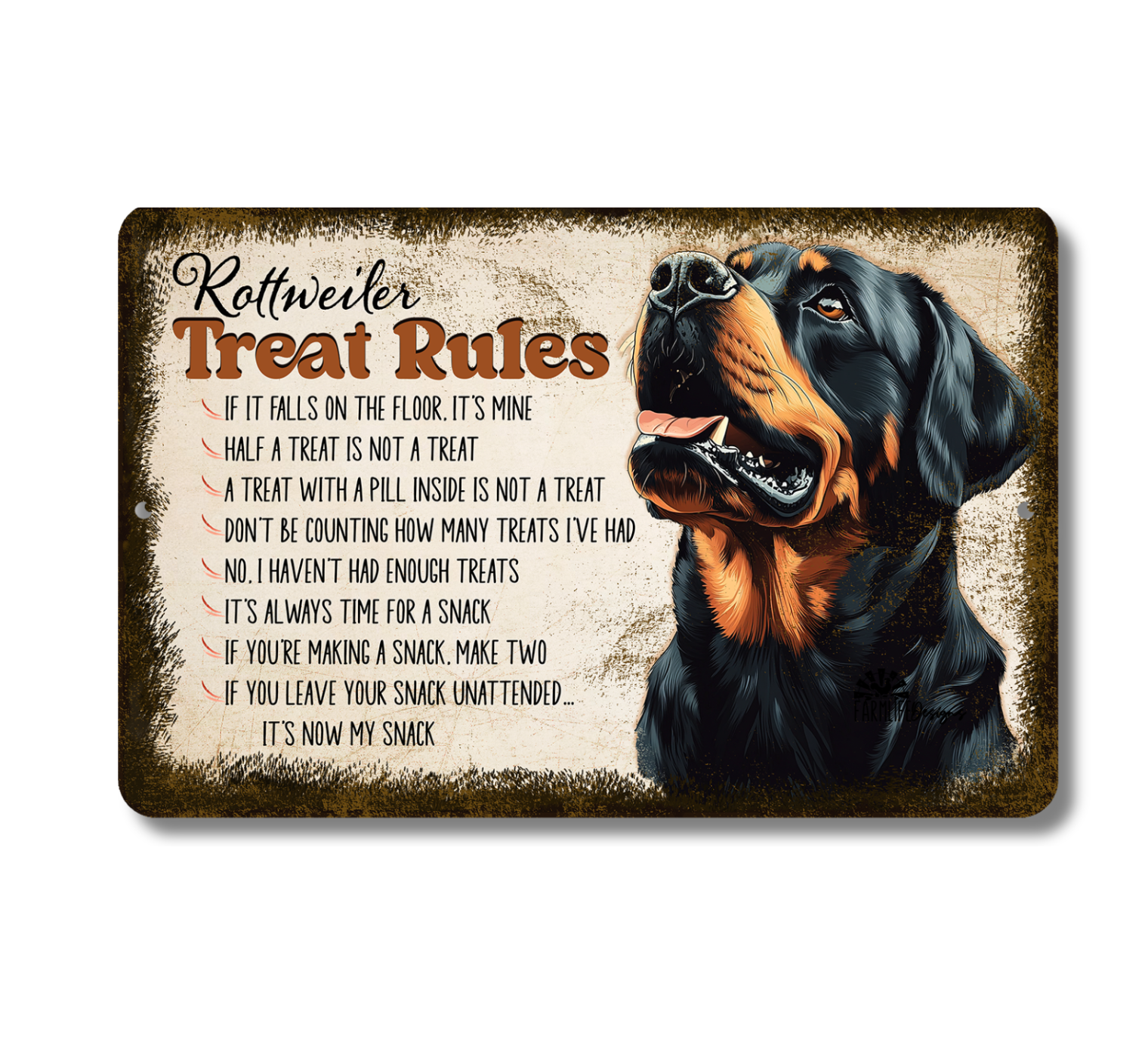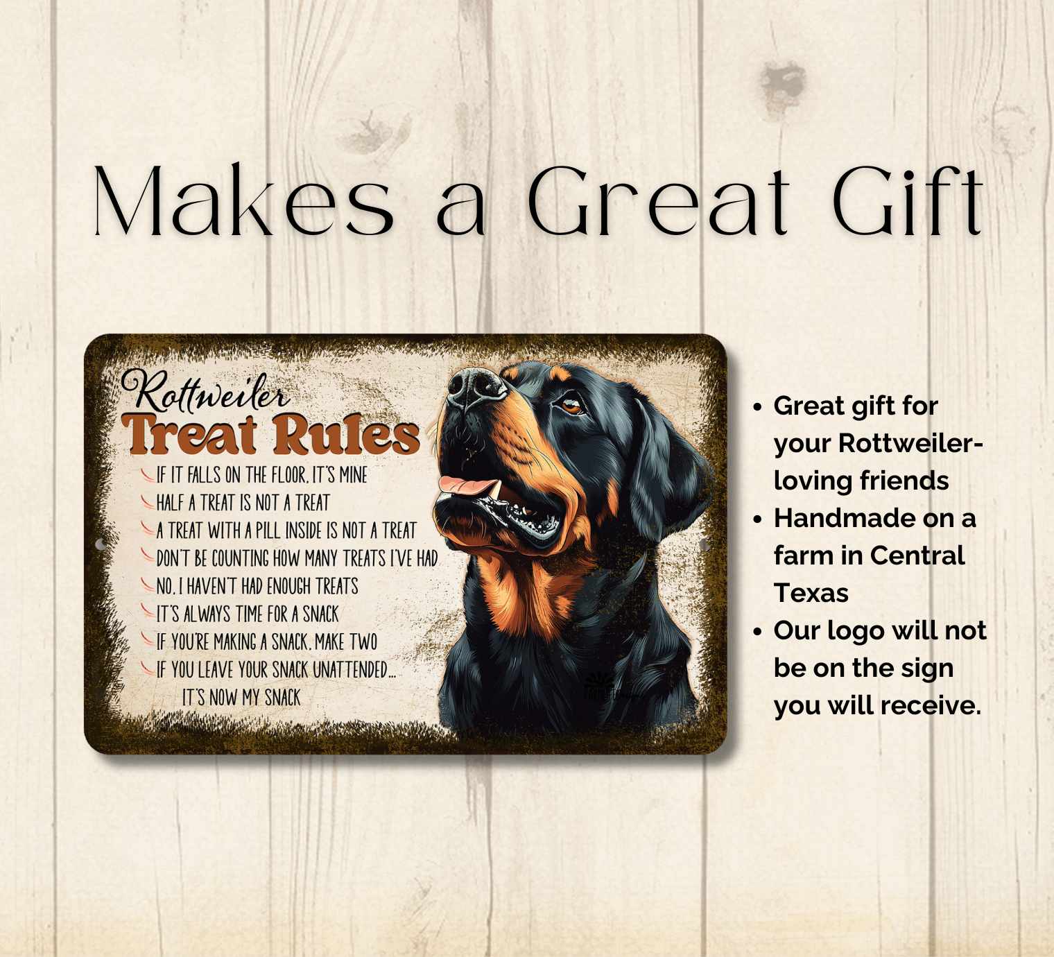Rottweiler Treat Rules. This sign would look great next to your coffee pot, on your porch, in your garden, in your kitchen or den... or just about anywhere.