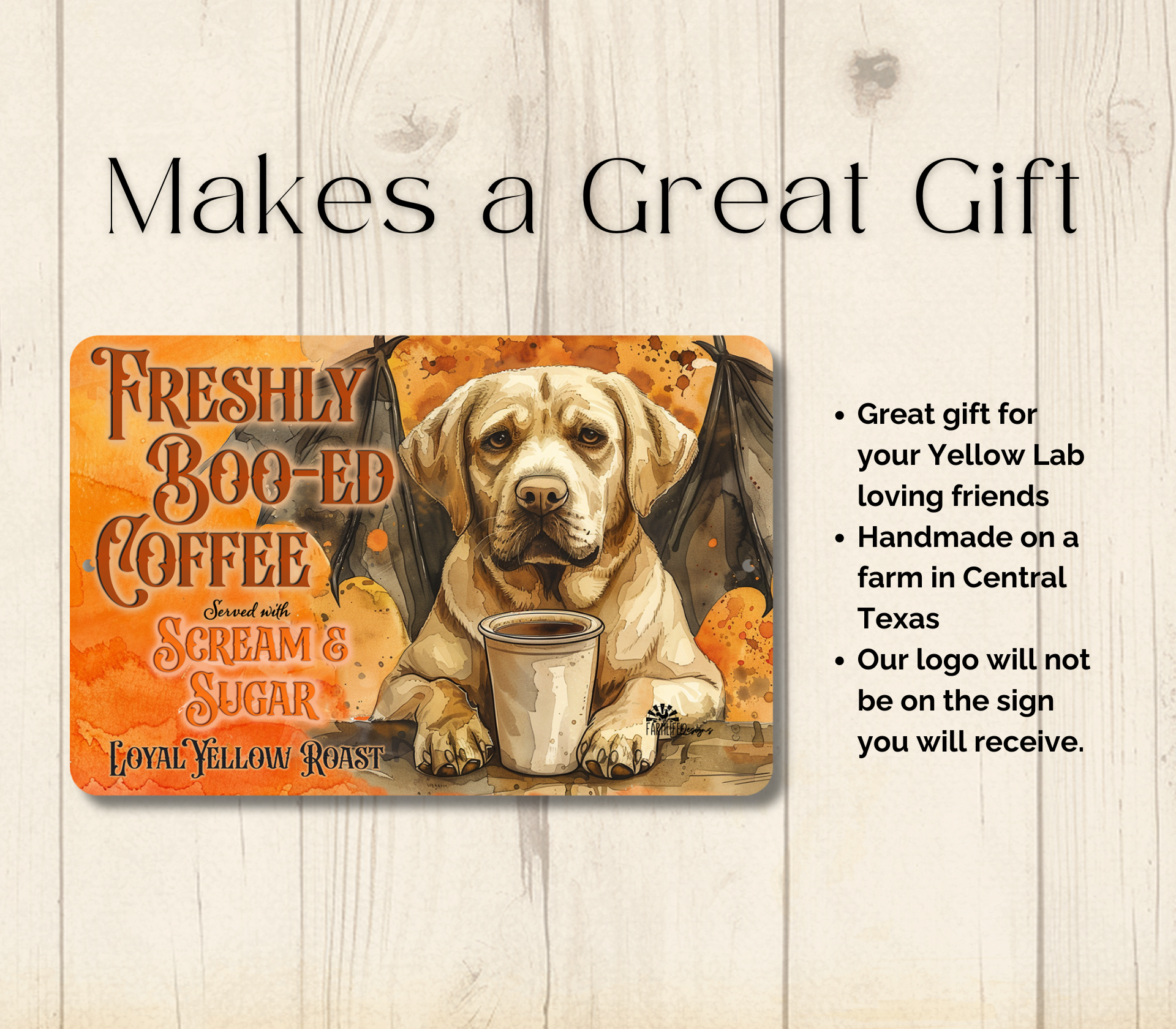 Yellow Lab Halloween Coffee Bar Funny Metal Tin Sign Fresh Boo-ed Coffee Labrador
